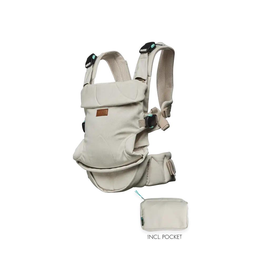 Ergonomien er i top: Baby sidder i korrekt frøstilling, og vægten fordeles godt på kroppen. Den passer fint til både mor og far, og designet er enkelt og moderne – helt uden dikkedarer.