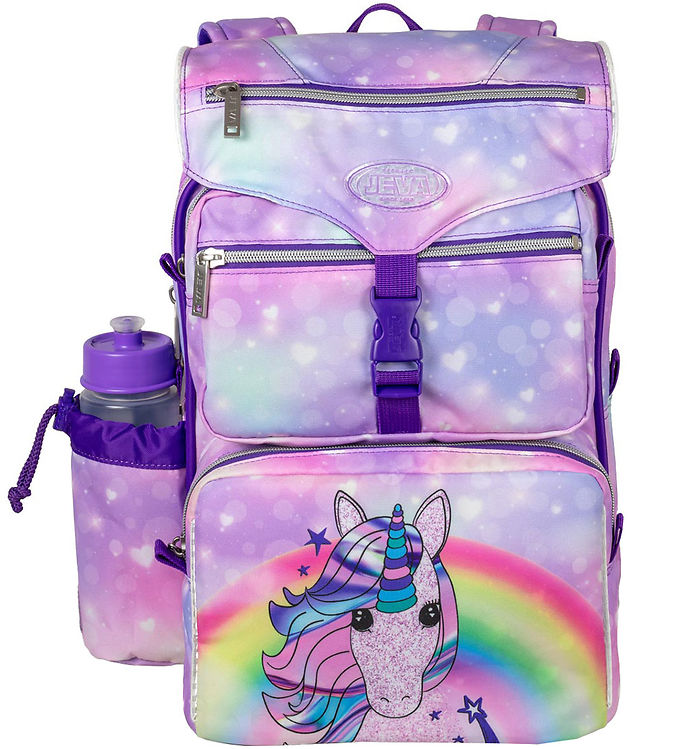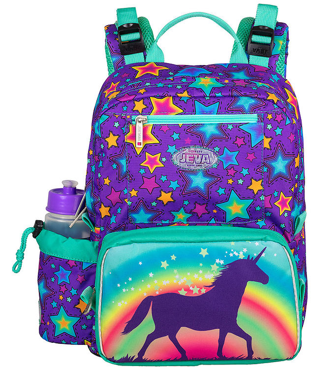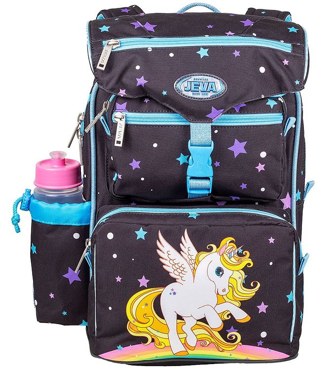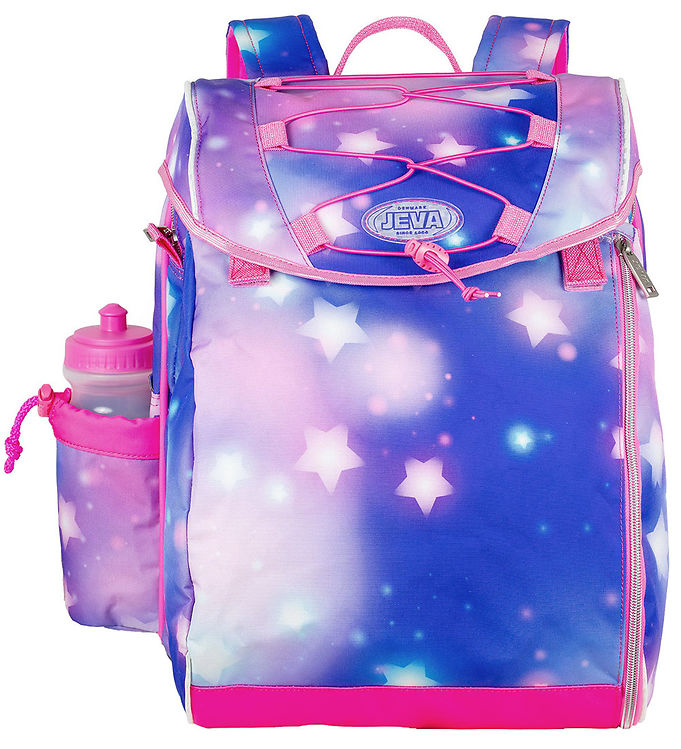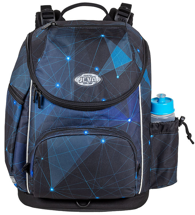 Jeva skoletasken, Intermediate, består et stort lynlåsrum med en polstret rumdeler samt to lommer foran. Det store rum har fint plads til madpakker og bøger og drikkedunken har sin egen smarte lomme på siden af tasken. Skoletasken lukkes på toppen med god bred klap, som sagtens kan holder det hele på plads, hvis tasken er for proppet til at lukke lynlåsen.